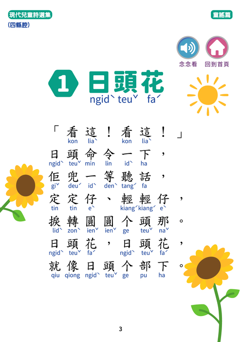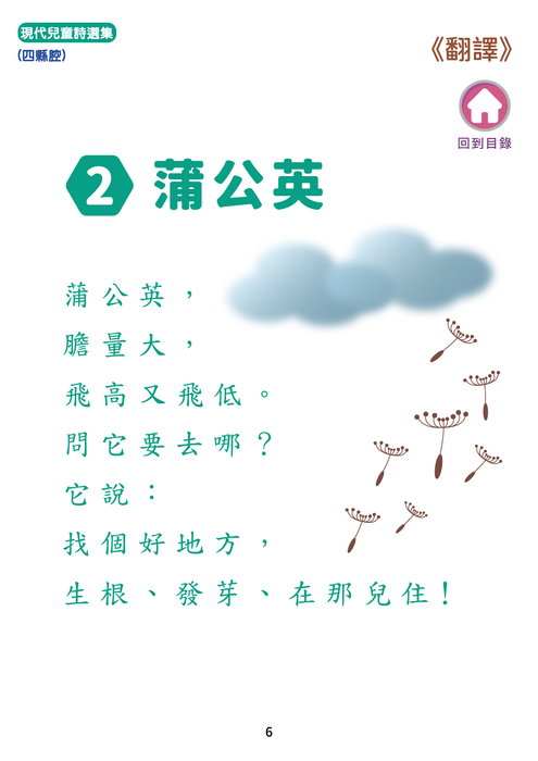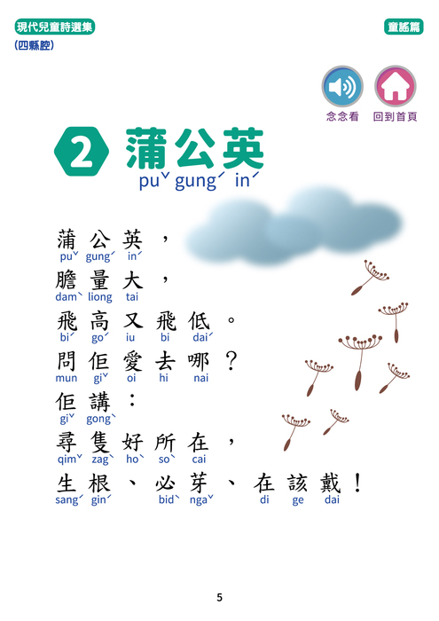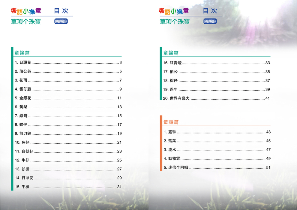 《草項个珠寶》-客語兒童詩歌集,精選龍潭在地客籍作家馮輝岳老師的最新作品,內容共收錄25首童謠、童詩,每首皆有完整華語翻譯。附四縣腔專業拼音,以四縣腔唸讀歌唱。
