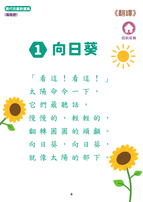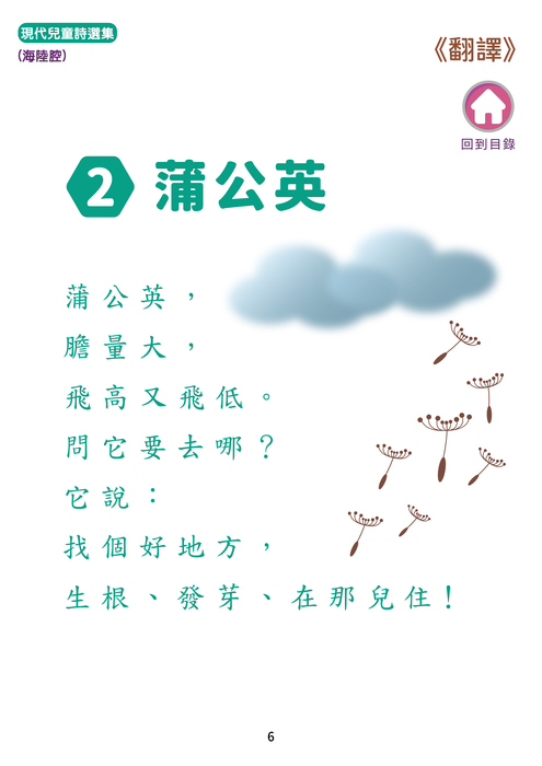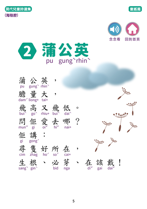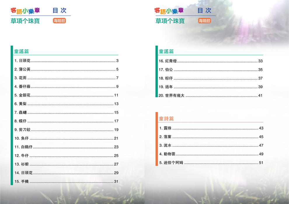 《草項个珠寶》-客語兒童詩歌集,精選龍潭在地客籍作家馮輝岳老師的最新作品,內容共收錄25首童謠、童詩,每首皆有完整華語翻譯。附海陸腔專業拼音,以海陸腔唸讀歌唱。